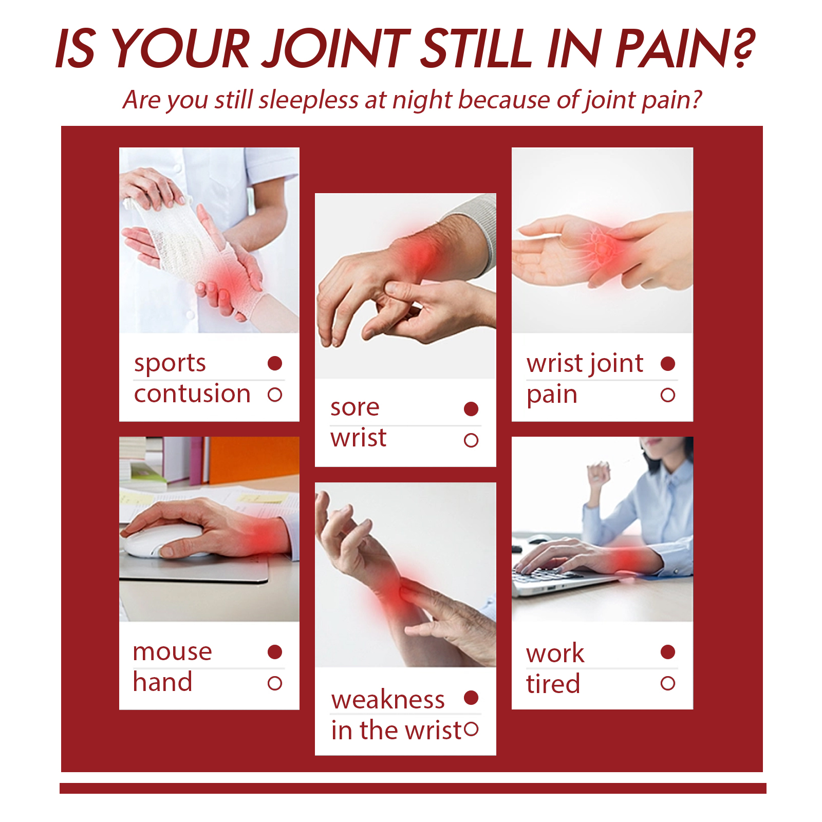 زيت إصلاح مفاصل الرسغ مُصمم خصيصاً للمساعدة في تخفيف آلام المفاصل وتيبسها والإجهاد اليومي الناتج عن الحركات المتكررة والأنشطة الرياضية وساعات العمل الطويلة. تركيبته سريعة الامتصاص تتغلغل بعمق لدعم مرونة المفاصل واسترخاء العضلات.