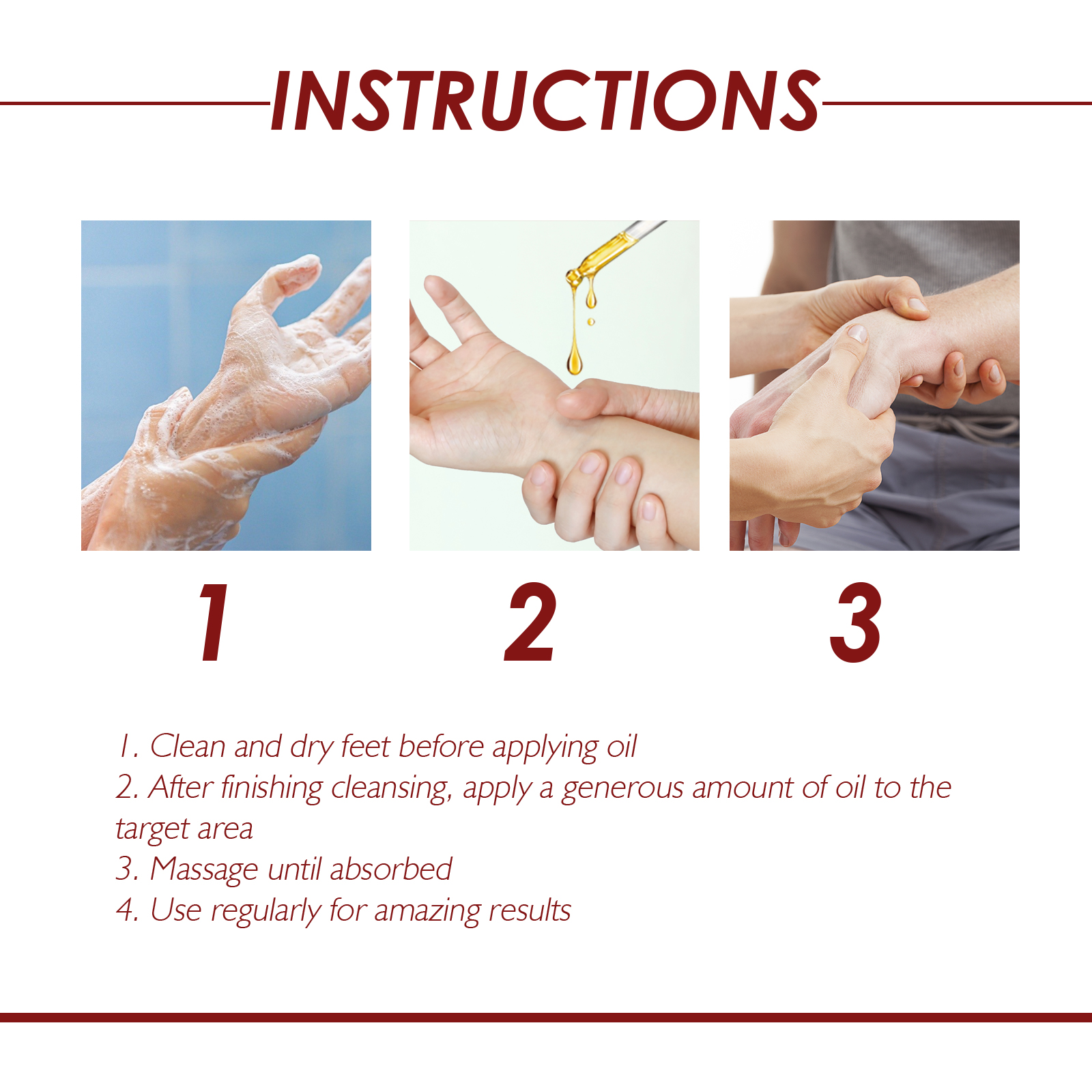 صُمم هذا الزيت خصيصاً للتدليك الموضعي، فهو يُحسّن الدورة الدموية حول منطقة الرسغ، ويُخفف الألم، ويُسرّع عملية التعافي. يُعدّ مثالياً لموظفي المكاتب، والرياضيين، وكل من يُعاني من إجهاد المفاصل، إذ يُوفر راحة طبيعية دون ترك أي أثر دهني.